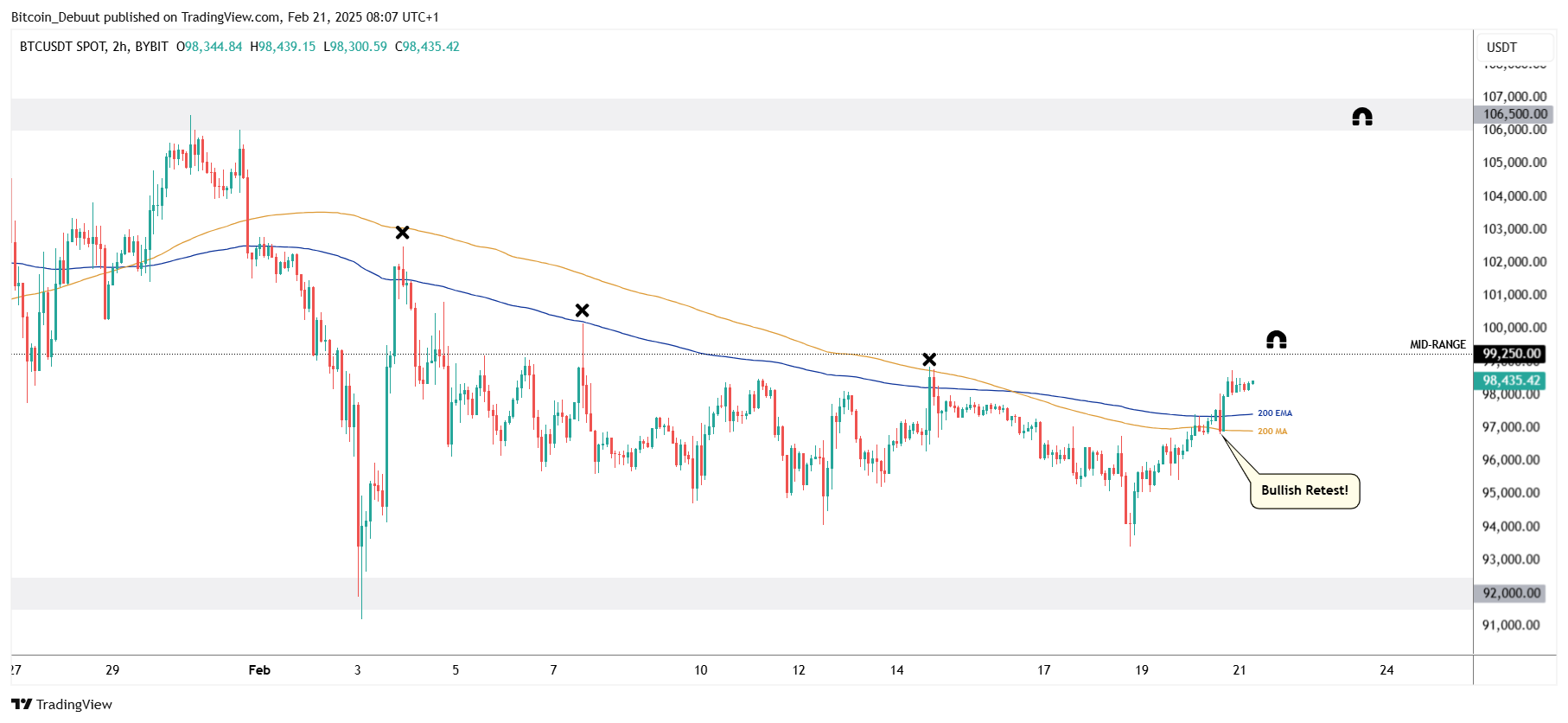 De afgelopen weken bevond bitcoin zich in een consolidatiefase, waarbij de 200 MA’s op lagere tijdsbestekken als sterke weerstand fungeerden. Zoals eerder besproken, zou een herovering van deze trend een eerste teken van kracht zijn. Gisteren was het dan eindelijk zover: na drie weken wist bitcoin zich opnieuw boven de 200 MA’s op de 2-uursgrafiek te werken.