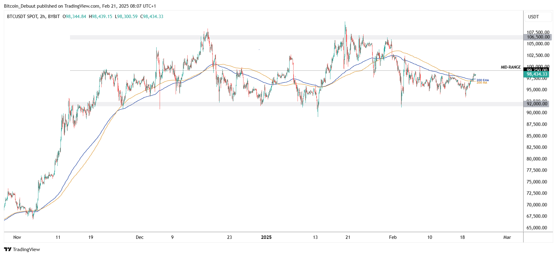 Het eerstvolgende belangrijke prijsniveau ligt op $99.250, het midden van de huidige range. Een overtuigende doorbraak boven dit niveau zou de deur kunnen openen richting de bovenkant van de range rond $106.500. Hoewel dit het eerste duidelijke teken van kracht in weken is, blijft het bredere beeld onveranderd. Bitcoin blijft gevangen in de consolidatiefase tussen $92.000 en $106.500, wat betekent dat we nog geen definitieve richting hebben.