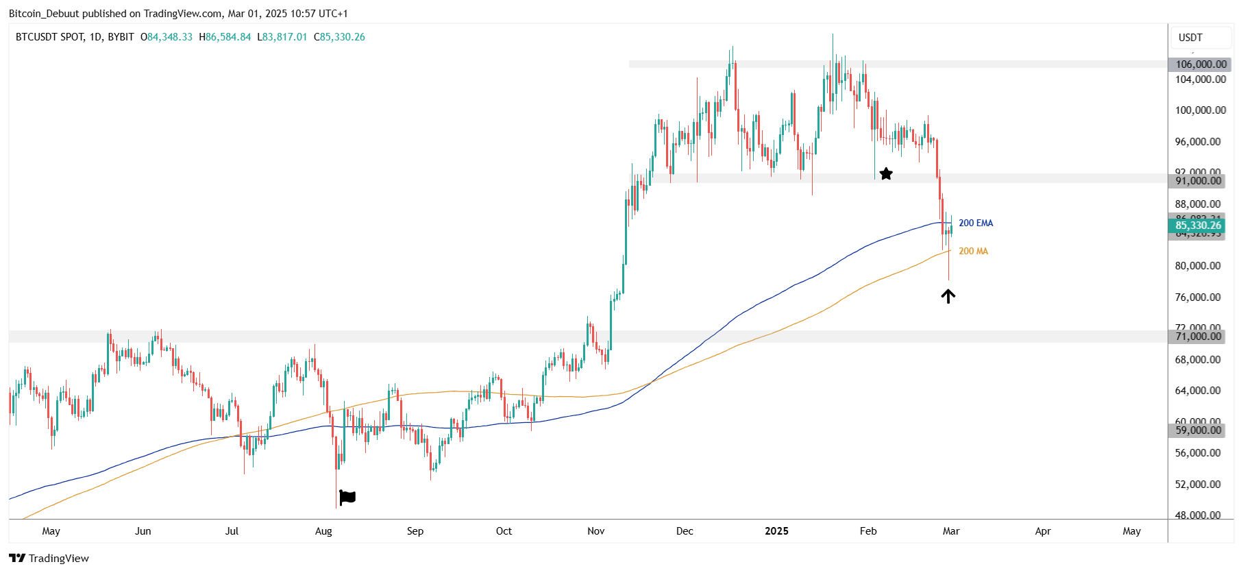 Sinds het dieptepunt van gisteren is de koers met ruim 10% gestegen. Dit is duidelijk zichtbaar in de lange wick op de dagelijkse kaars. Bovendien heeft bitcoin hierdoor opnieuw de 200 MA heroverd.
