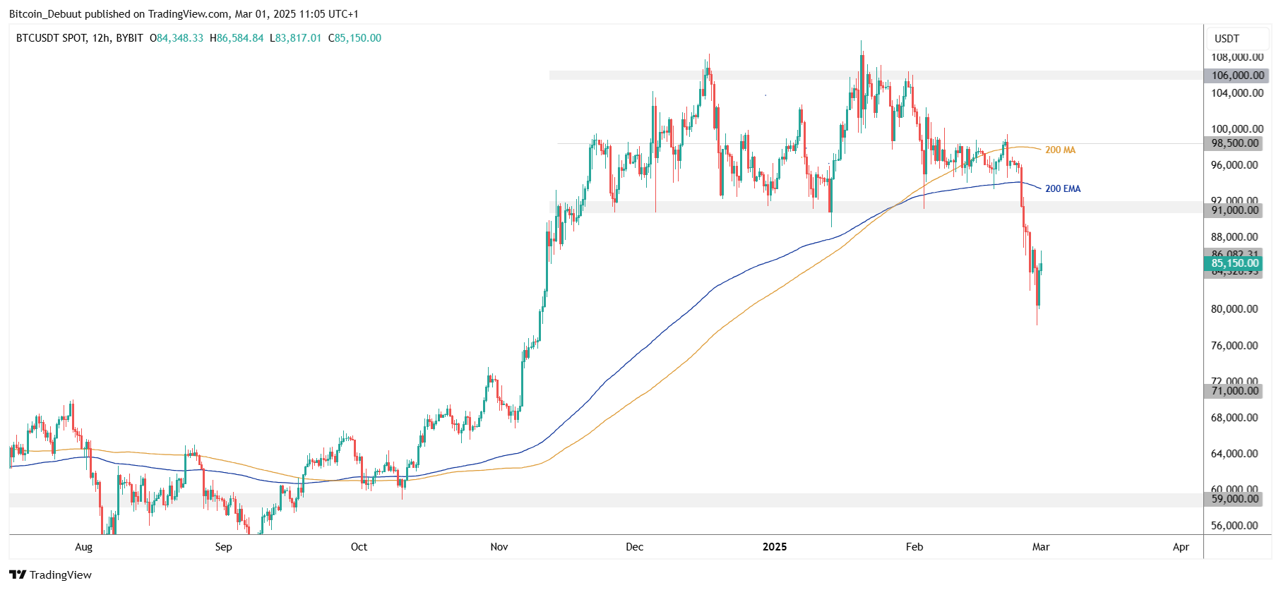 Een eerste teken van kracht, en het moment waarop we weer voorzichtig bullish kunnen worden, is het terugwinnen van de 200 MA’s in combinatie met de onderkant van de prijsrange rond $91.000. Dit sluit aan bij de analyse van de 12-uursgrafiek.